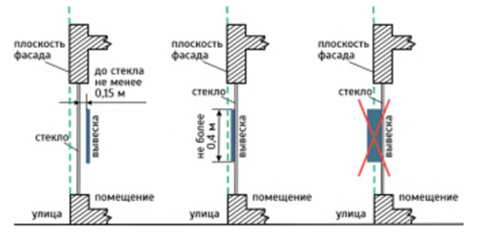 При размещении вывески в витрине (с её внутренней стороны) расстояние от остекления витрины до витринной конструкции должно составлять не менее 0,15 метра.