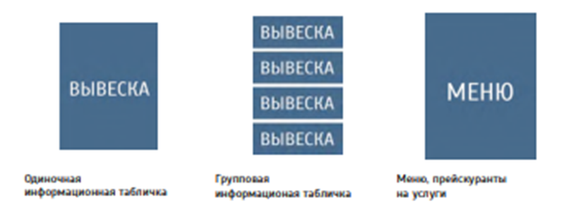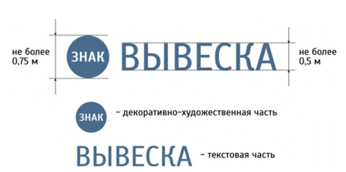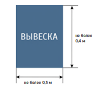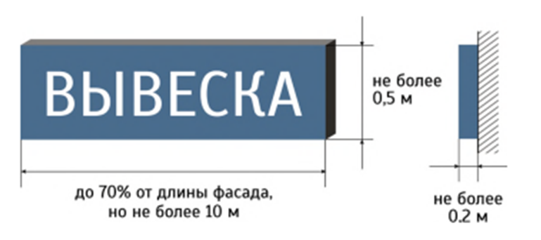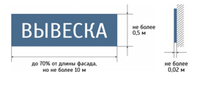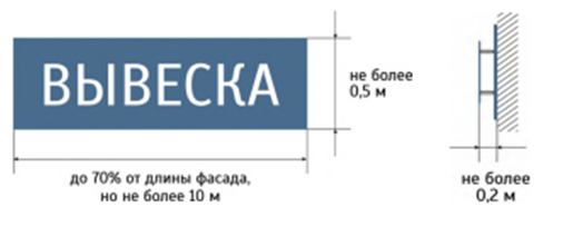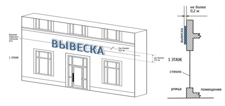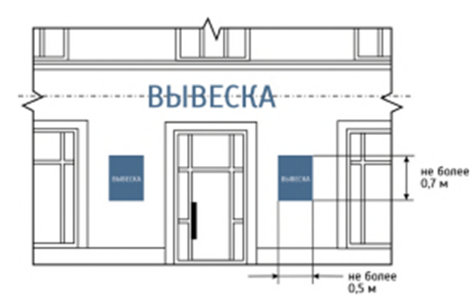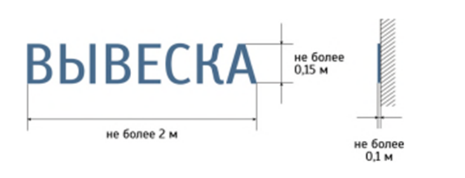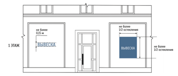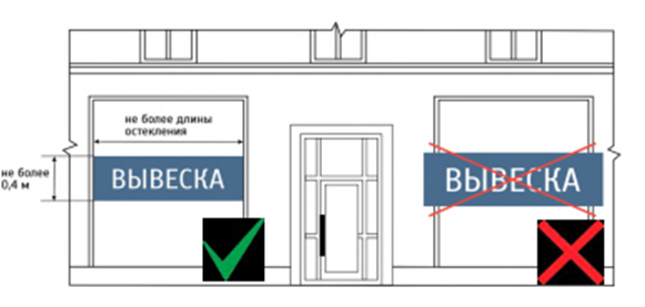 Информационные конструкции, размещённые на внешней стороне витрины, не должны выходить за плоскость фасада объекта. Параметры вывески, размещаемой на внешней стороне витрины, не должны превышать в высоту 0,40 метра, в длину — длину остекления витрины