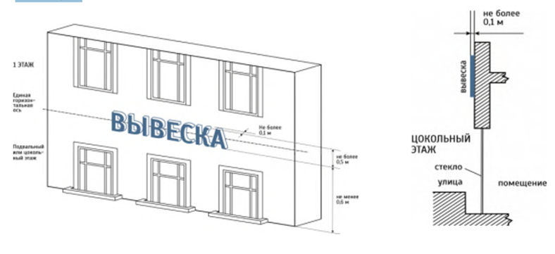 Если помещения располагаются в подвальных или цокольных этажах здания, вывески могут размещаться над окнами подвального или цокольного этажа, но не ниже 0,6 м от уровня земли до нижнего края информационной конструкции. При этом вывеска не должна выступать от плоскости фасада более чем на 0,1 м.