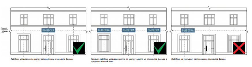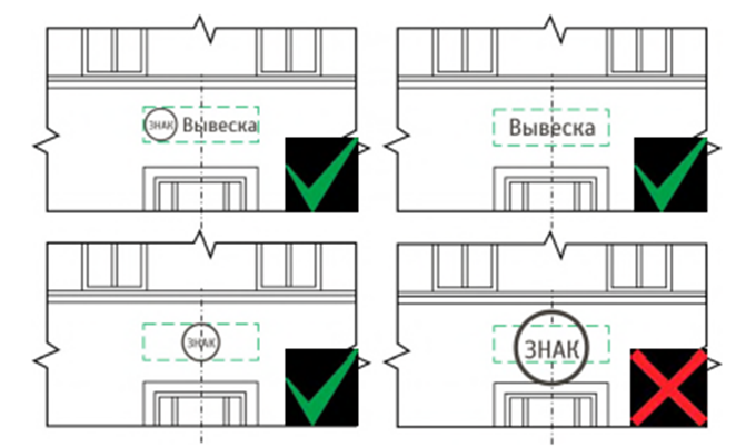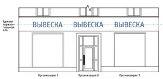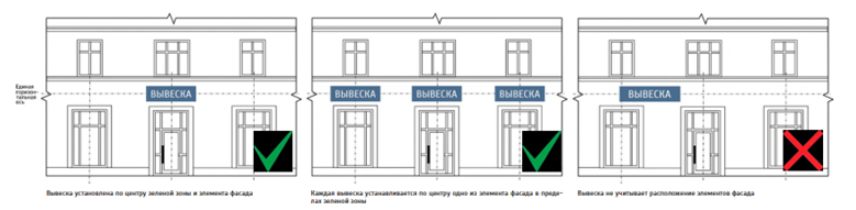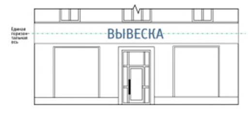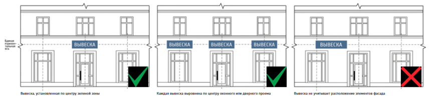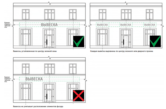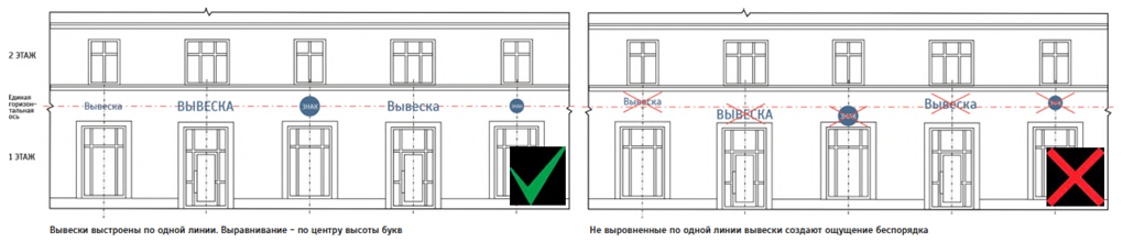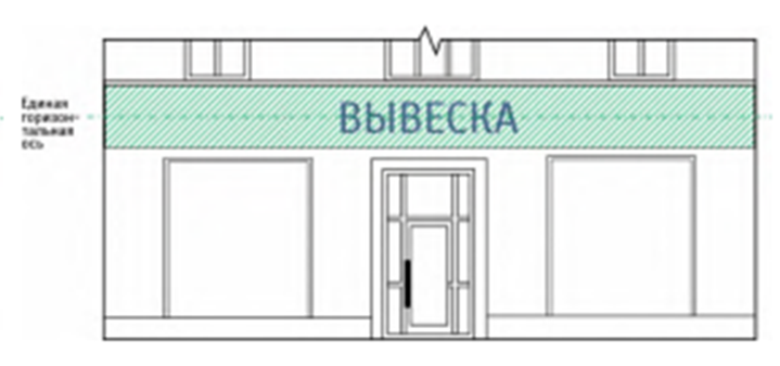 Вывески оптически выравниваются по центру единой горизонтальной оси. При размещении новой вывески на фасаде нужно принимать во внимание расположение и размер уже существующих вывесок.
