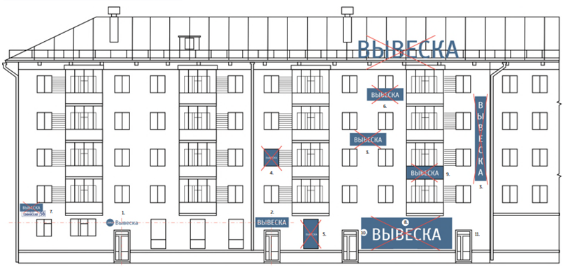 Схема размещения возможных вариантов вывесок на фасаде здания\