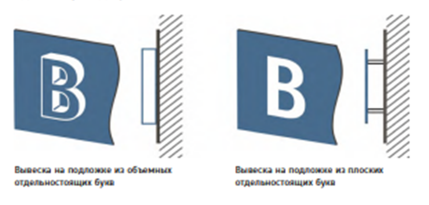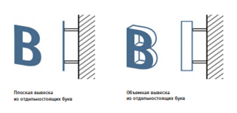 Плоские буквы и знаки размещать на некотором расстоянии от стены, для того чтобы падающая тень создавала объём, и вывеска лучше читалась.