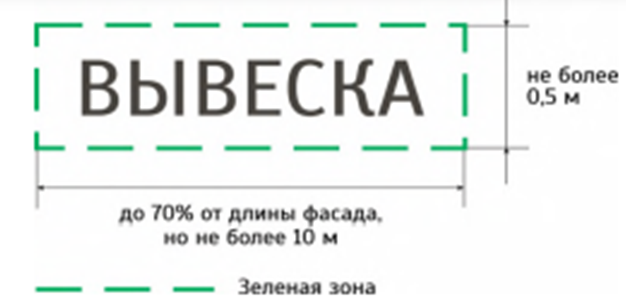 ЗЕЛЕНАЯ ЗОНА — это область фасада здания, на которой разрешена установка вывесок. Конкретное расположение и максимальная площадь зеленой зоны зависит от типа и параметров архитектурного элемента фасада, на котором предполагается установка.