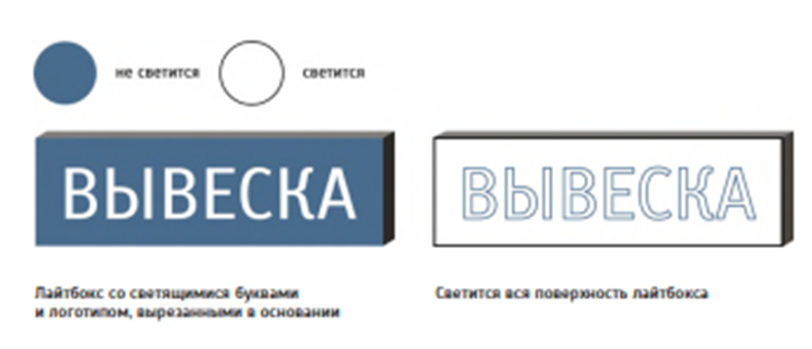 Данный тип вывески является наименее предпочтительным для видовой зоны регламентации, так как большая толщина короба и слишком сильное свечение больше других разрушает архитектурное единство здания. Тем не менее, при комплексном проектировании и грамотном дизайне с качественным исполнением, лайтбоксы можно успешно использовать.