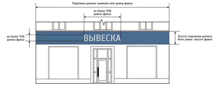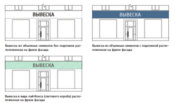 Размещение настенной конструкции (настенных конструкций) в виде светового короба (световых коробов) на фризе допускается только при условии организации данного светового короба (световых коробов) на всю высоту соответствующего фриза.