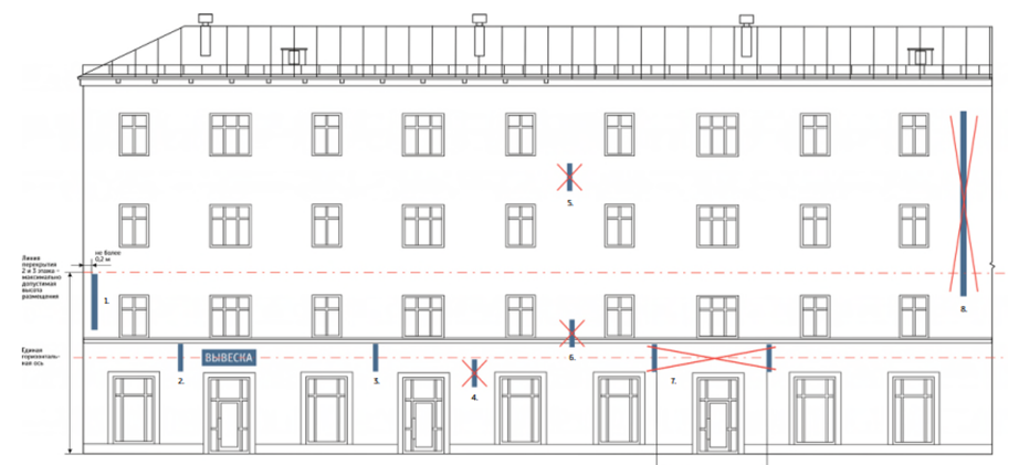 Для вывесок, расположенных между 1 и 2 этажом здания, крайняя точка элементов настенной конструкции не должна находится на расстоянии более чем 0,2 м от плоскости фасада.